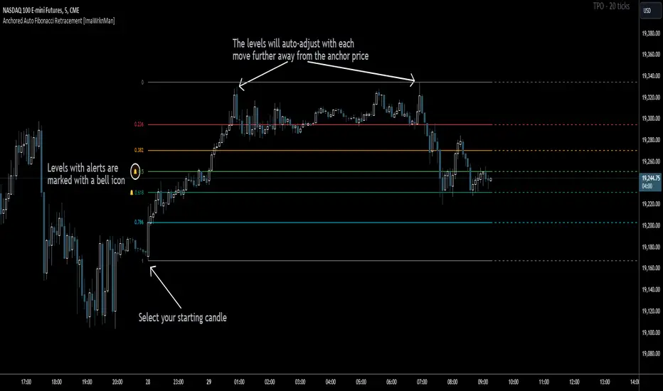 Automatically generates a Fibonacci Retracement anchored to the candle of your choosing. As price moves further away from the anchor point, the fib levels automatically adjust to represent the entirety of the move.