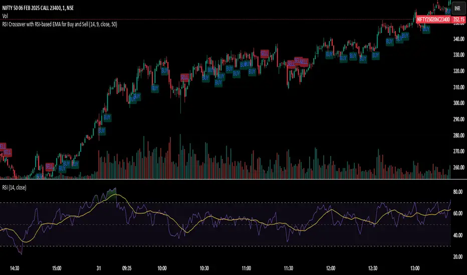 This script generates buy and sell signals based on the crossover of the Relative Strength Index (RSI) and the RSI-based Exponential Moving Average (EMA). It also includes an additional condition for both buy and sell signals that the RSI-based EMA must be either above or below 50.