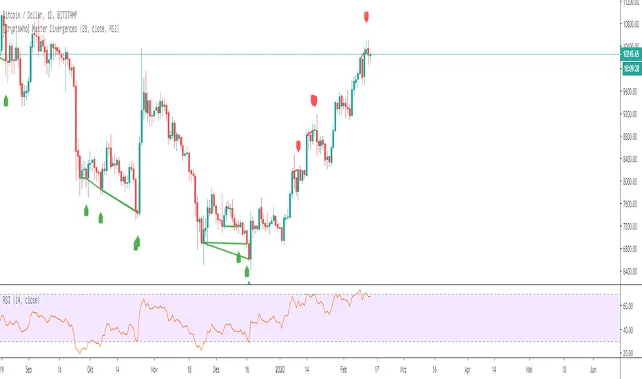 You can choose between RSI, Stoch RSI, MACD, CCI, OBV and WaveTrend (LazyBear) and define your look back period as well as the candle source the indicator should work on.
