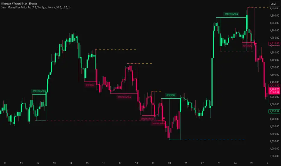 The Smart Money Price Action Pro is designed to bring together multiple layers of market analysis into a single, cohesive framework, combining trend identification and consolidation detection in an actionable format. While individual indicators can provide useful insights, they often work in isolation. This toolkit integrates market flow detection, range analytics, and adaptive visualization into one system, allowing traders to see the bigger picture without piecing together multiple disconnected tools.