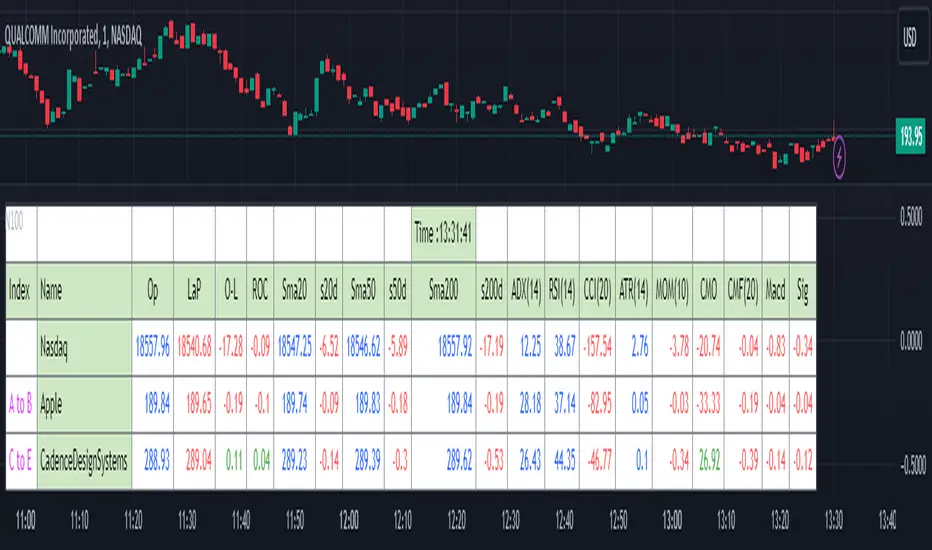 Nasdaq 100 screener is a simple table , which facilitate to view 6 different stocks at a time (inclusive one from Master list of “Input A to Z” with a display of 19 parameters.