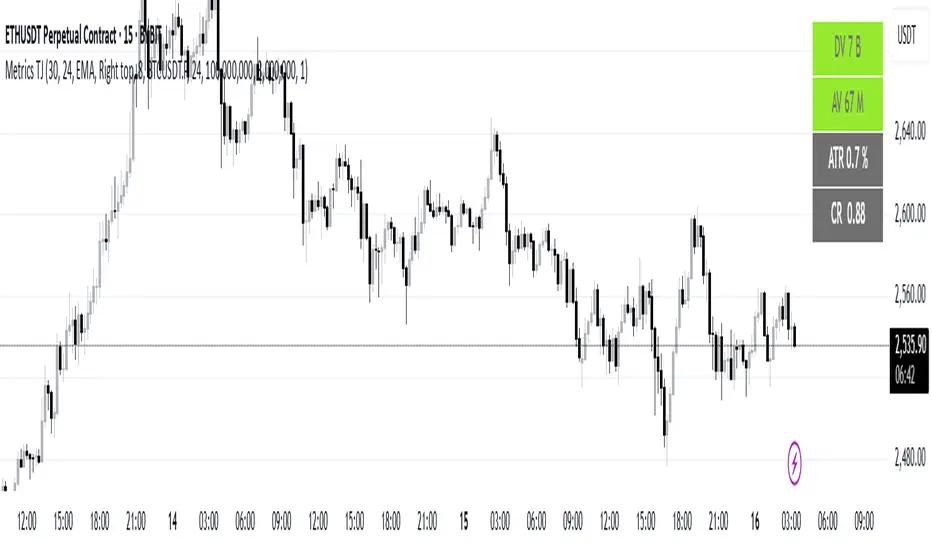 Metrics TJ is a powerful market metrics tool designed for intraday traders. It provides essential market data — including volume, ATR (Average True Range), and correlation with other assets — to help you make informed decisions. By combining multiple indicators into a unified view, this tool allows you to spot key trends, volatility, and relative strength within a single chart.