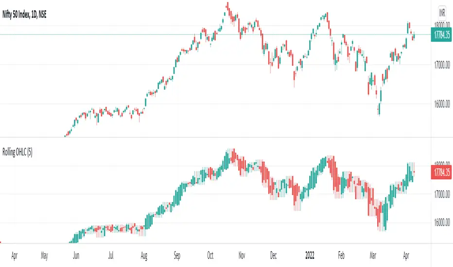 - Prominently, traders use Heikin Ashi Candles to locate trends or trading opportunities easier than traditional candlesticks. But the OHLC in those Heikin Ashi candles doesn't match with conventional candlesticks. We can use these Rolling OHLC Candles as an alternative for Heikin Ashi Candles because Here we can locate trends or trading opportunities easier than traditional candlesticks, and also close of these candles matches the close of the standard candlesticks, which can help us to take trades based on the close of the candles.