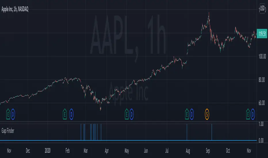 This indicator finds gaps based on User specified input % threshold in the indicator settings. Histogram plot shows gaps as vertical lines for easy detection. Enjoy!