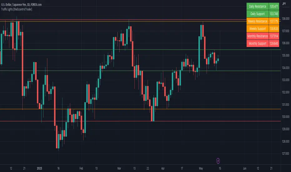 If the current timeframe is higher than any of the traffic light timeframes the relevant lines and table cells will automatically be hidden. As can be seen in Figure 1. below, the intraday lines and table cells will only appear if the user scales down to a low enough timeframe.