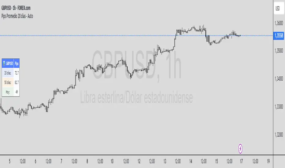muestra el promedio de pips de los ultimos 50 dias los ultimos 20 dias y lo que se ha movido en el dia en curso.