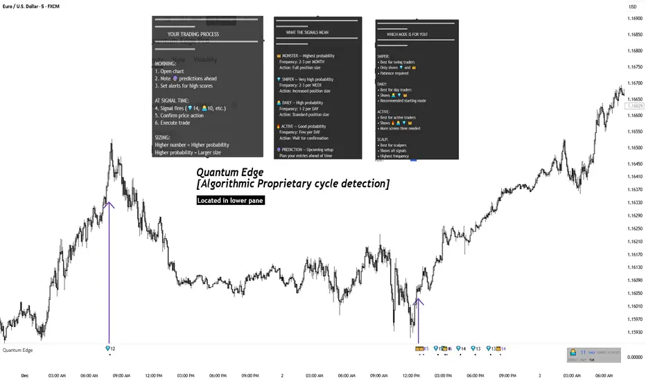 Quantum Edge is a time-based cycle alignment scanner built on fractal cycle theory. Markets move in nested cycles across multiple timeframes. This indicator detects moments when several of these cycles simultaneously reach mathematically significant positions, creating potential turning points.