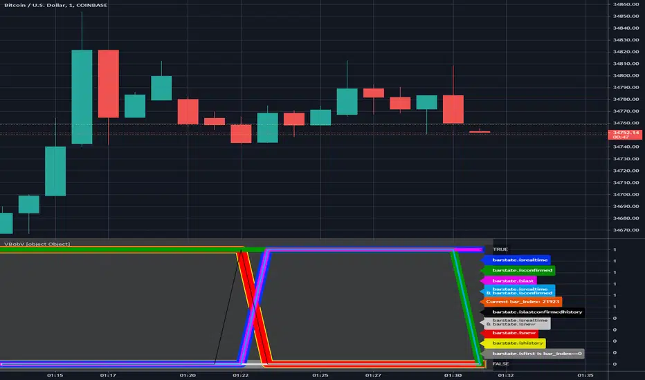 These barstate variables change from TRUE to FALSE or FALSE to TRUE during specific times/conditions of script operation. One unique state you might not ever see change is barstate.isfirst. This is only TRUE when bar_index==0, most easily viewed on the monthly "All" chart on the far left. I provided a label displaying the current bar_index for perspective. I hope this provides an improved grasp of barstate understanding for fellow members, as it did for myself.