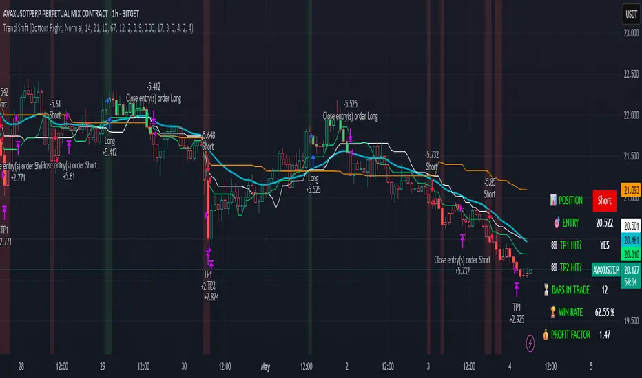 Trend Shift is a fully original and carefully engineered algorithmic trading strategy — not just a mash-up of common indicators. It is purpose-built for high-accuracy crypto trend trading on the 1H timeframe using a layered decision framework. Every component has a defined role in identifying high-probability trades while avoiding lag and false signals. The logic has been rigorously tested to ensure non-repainting, stable behavior, and clear entry/exit timing — with support for webhook automation and customizable dashboards.