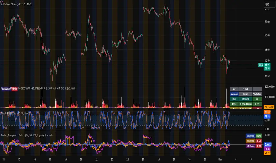 This indicator calculates and displays the compounded return over rolling time periods, showing how an investment would have performed if held for the specified lookback length.
