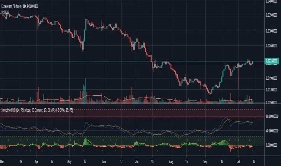 Added a histogram to show the difference between the actual RSI and Smoothed RSI.Also, added arrows above and below the 0 line to show when the Smoothed RSI changes directions.