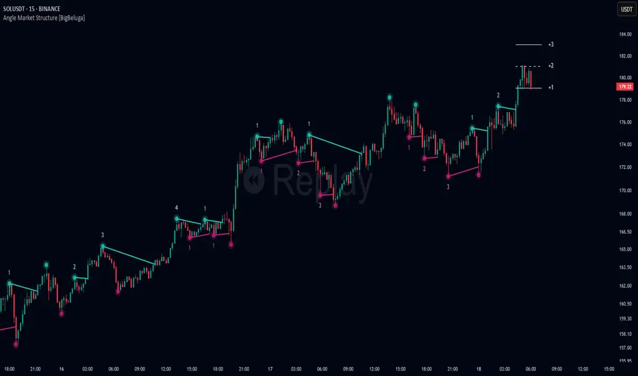 Angle Market Structure [BigBeluga] is a smart pivot-based tool that dynamically adapts to price action by accelerating breakout and breakdown detection. It draws market structure levels based on pivot highs/lows and gradually adjusts those levels closer to price using an angle threshold. Upon breakout, the indicator projects deviation zones with labeled levels (+1, +2, +3 or −1, −2, −3) to track price extension beyond structure.