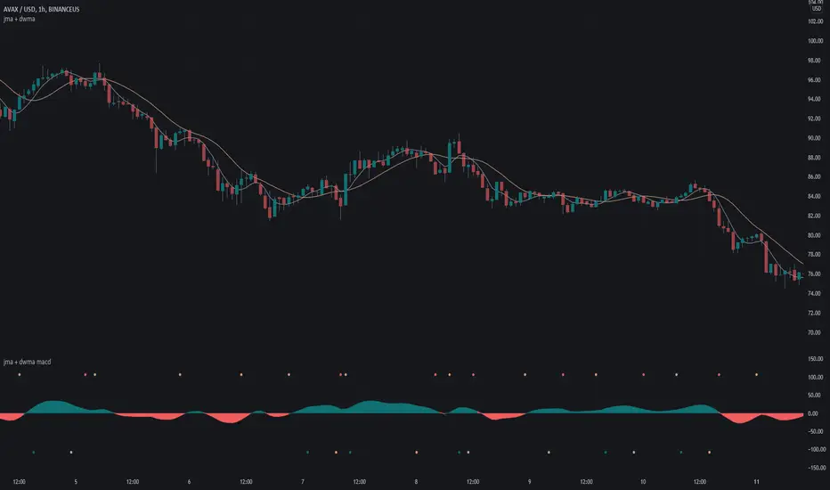 The indicator consists of the faster Jurik Moving Average ( JMA ) and the slower Double Weighted Moving Average (DWMA). A long signal (green dot at the bottom) is shown when the JMA line crosses above the DWMA line (indicating a possible reversal in trend). A short signal (red dot at the top) is shown when the JMA line crosses below the DWMA line. Take profit signals (tan dot at the top/bottom) are shown when the JMA line reverses directions. Alerts for signals are included in this indicator.