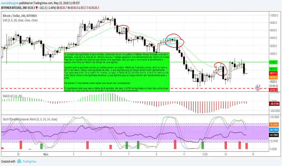 O conceito das agulhadas é bem simples, colocando-se em um gráfico 3 Médias Móveis Simples, uma de 3 períodos, uma de 8 e uma de 20, sempre que as 3 médias passarem simultaneamente por dentro do Corpo Real de um Candle nós dizemos que temos uma agulhada. Isto por que o movimento é semelhante a passar uma linha por dentro da cabeça de uma agulha.