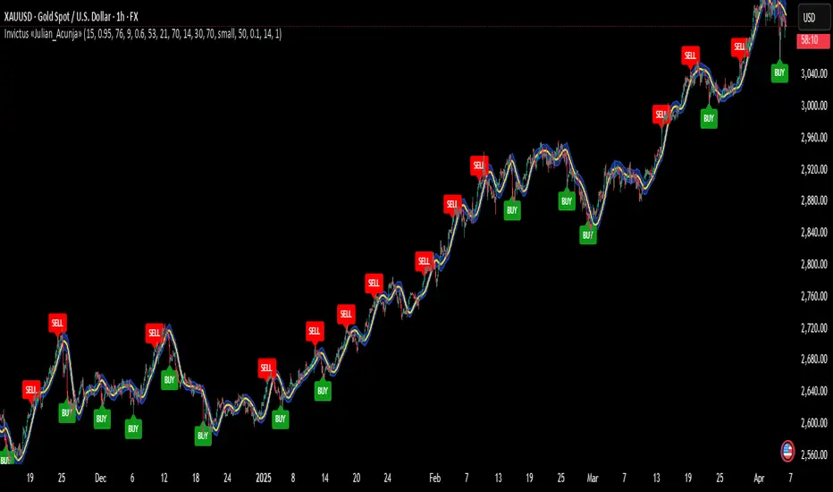 Invictus is a technical trading indicator designed to support traders by identifying potential buy and sell signals through a probabilistic and adaptive analytical approach. It aims to enhance the analytical process rather than provide explicit trading recommendations. The indicator integrates multiple analytical components—price pattern detection, momentum analysis (RSI), dynamic trend lines (Kalman Line), and volatility bands (ATR)—to offer traders a structured and contextual framework for making informed decisions.