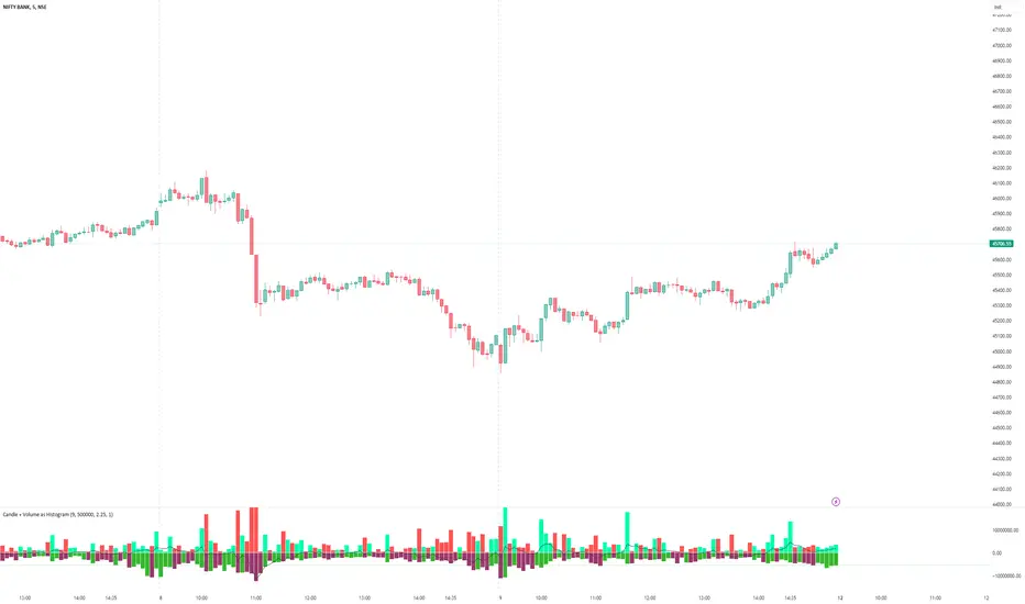 Now plot Candle and Volume as Histogram Oscillator. It is a very simple but very effective indicator to see what is happening at Volume and Candle levels. It clearly plots whether the market is trending, volatile, what is going to happen in next candles etc. Above Zero is price candle and below Zero is Volume histogram.