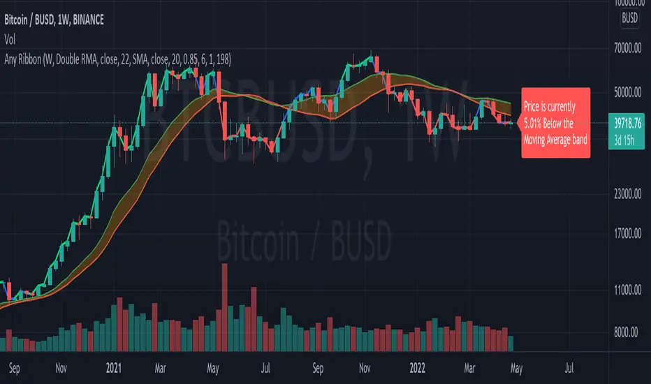 This indicator displays a ribbon of two individually configured Fast and Slow and Moving Averages for a fixed time frame. It also displays the last close price of the configured time frame, colored green when above the band, red below and blue when interacting. A label shows the percentage distance of the current price from the band, (again red below, green above, blue interacting), when the price is within the band it will show the percentage distance from median of the band.