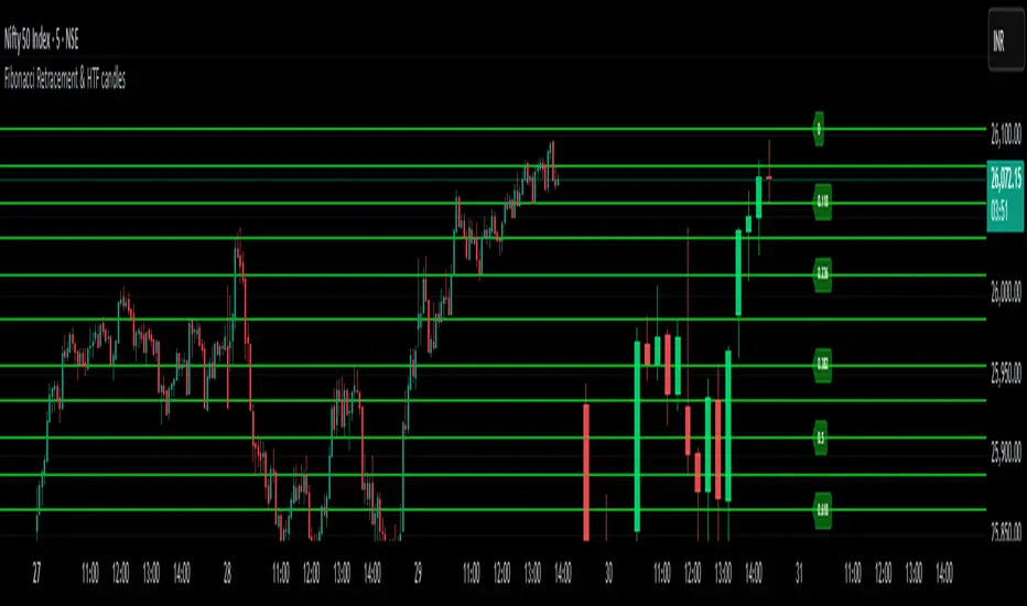 The Fibonacci Retracement & HTF Candles combines higher-timeframe candles with a dynamic Fibonacci range system, helping traders visualize key market structure and retracement zones in one unified chart view.