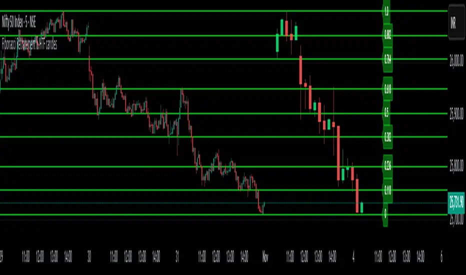 The Fibonacci Retracement & HTF Candles combines higher-timeframe candles with a dynamic Fibonacci range system, helping traders visualize key market structure and retracement zones in one unified chart view.