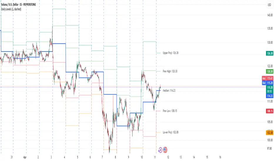 The Daily Levels indicator plots key price levels from the previous trading day, including the high, low, median (pivot), and projected extensions. These levels help traders identify potential support/resistance zones and anticipate breakout or reversal opportunities.