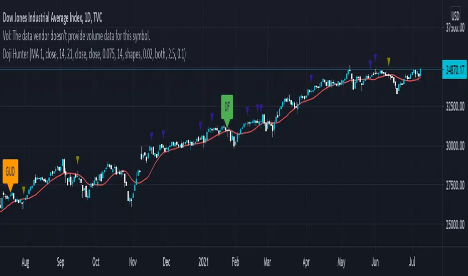 "Simplify Northern/Southern Dojis" (boolean) makes this script ignore trend direction for Doji detection and consolidates Northern and Southern Dojis into being recognized as the same. This has an added effect of removing the plotted moving averages from the screen.
