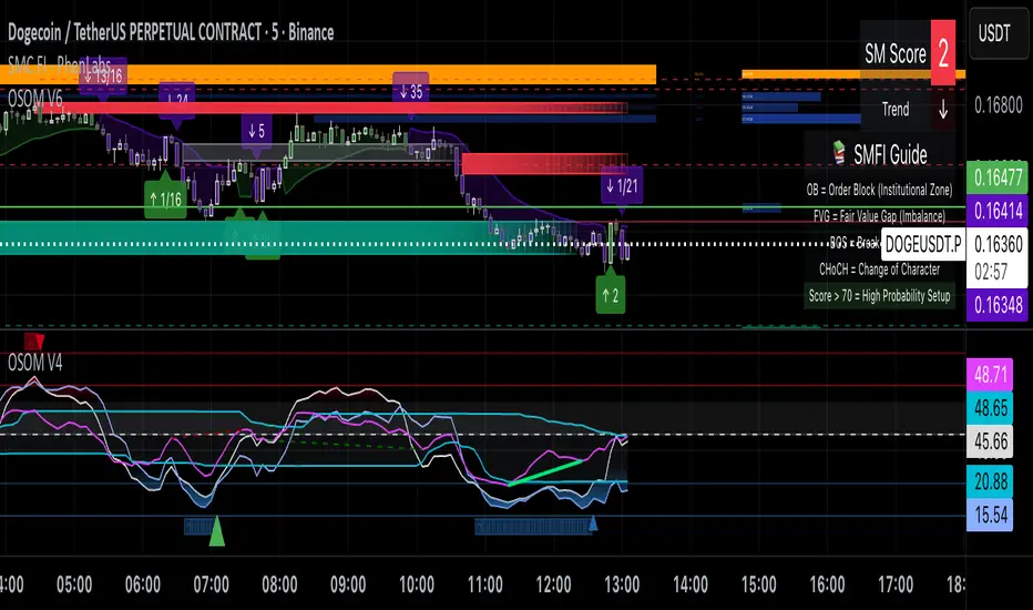 This "OSOM V6" aids trading by providing visual and signal-based insights: