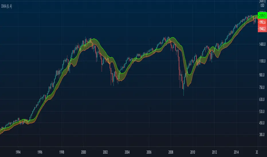 The Displaced Moving Average Channel (DMA) indicator is a combination of two moving averages calculated on the high and low of a set time period back which are displaced forward or backward with the center highlighted as a central channel.