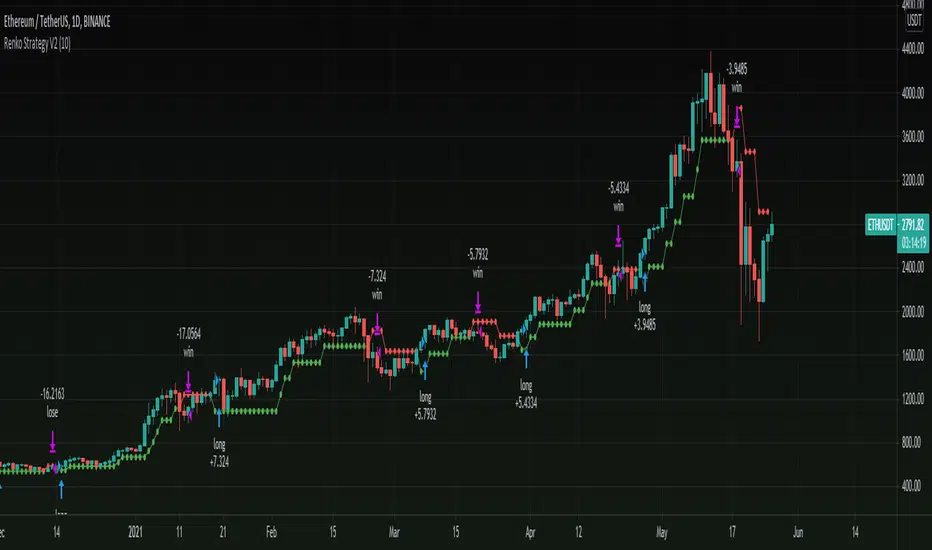 Version 2.0 of my previous renko strategy using Renko calculations, this time without using Tilson T3 and without using security for renko calculations to remove repaint!