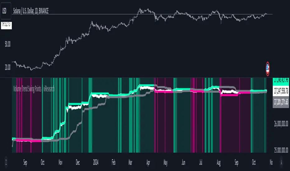 The "Volume Trend Swing Points" script is designed to identify pivotal swing points in market trends by leveraging the Price Volume Trend (PVT) indicator. This unique approach combines price and volume movements to highlight moments when a market may experience a significant trend reversal. By detecting the highest and lowest points of the PVT over customizable periods, this script aims to provide traders with valuable insights into potential bullish or bearish market behavior.
