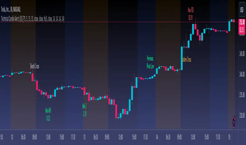 The Technical Candle Alert indicator provides alerts based on multiple underlying technicals, including MFI, RSI, Stochastics, Z-Score, Pivot points and the EMA 50 and EMA 200 Death and Golden Cross.