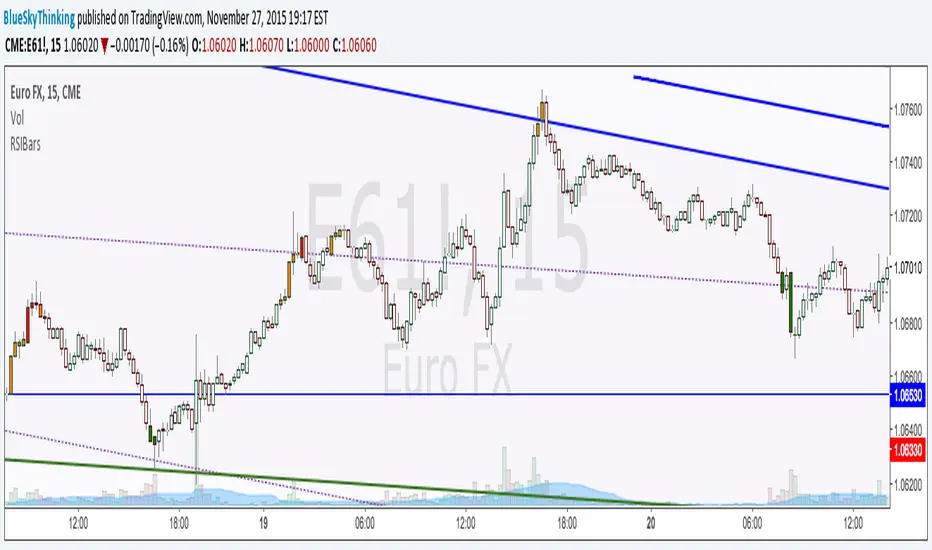 High lights the bars based on the RSI (to avoid losing space for another indicator)