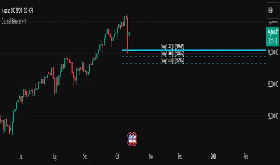 Optimal Retracement is a clean, professional Fibonacci retracement engine that finds price cluster zones where multiple retracements from recent swings align within a tight range. It mirrors the minimalist style of your projection tool: single horizontal lines, right-edge labels with ratio and price, optional price-scale markers, and a clustering core that designates one Prime retracement level with spaced Secondary levels.