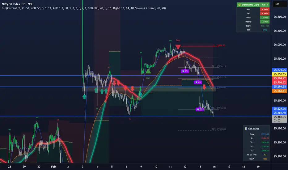 Unlike indicators that only show signals, Brahmastra Ultra provides the complete trading workflow — from trend identification to entry, risk calculation, target tracking, and exit — all in one unified system with a weighted Confluence Score (0–100) that gates every entry.