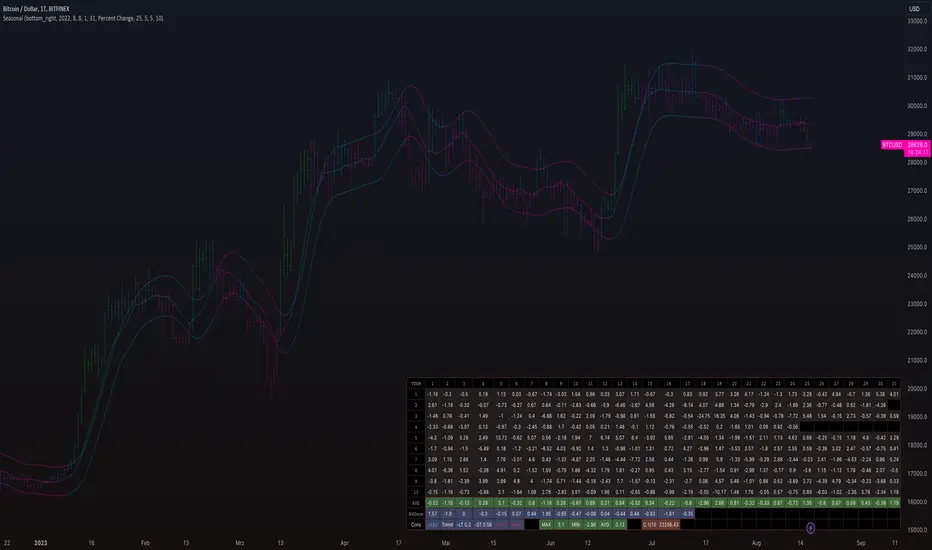 Within the "Summary" row, the indicator calculates the average change for each selected trading day within a specified time frame. This calculation, rooted in Larry Williams' concept, considers trading days rather than calendar days. The "Summary" row provides a quick insight into whether the current price change exceeds or falls short of the average change within the chosen time frame.