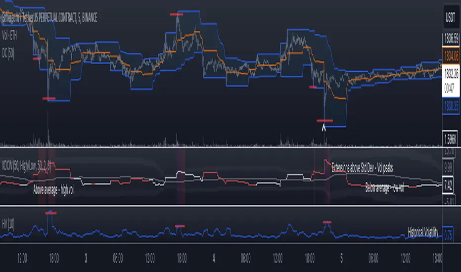 Experimental gauge of volatility. Channel Width greater than average over lookback period shows higher levels of volatility, whereas channel width below average is correlated to low historical volatility. Extensions of width over user selected standard deviations show peaks in volatility.