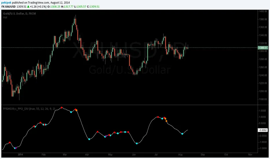 Beta divergence indicator, you can exchange the Price Percentage Oscillator (PPO) for any oscillator. You can play around with the look-back period if you want to use long term divergences.