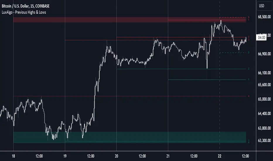 The Previous Highs & Lows indicator highlights a user-set amount of previous maximum/minimum prices made within specific intervals, these are displayed as levels customizable levels.