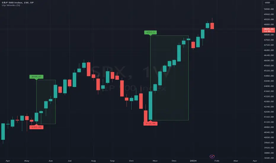 The indicator draws boxes when close to close returns are positive for at least a specified number of bars. The last bar is only included in the box (if positive) after the market is closed, to avoid false positives.