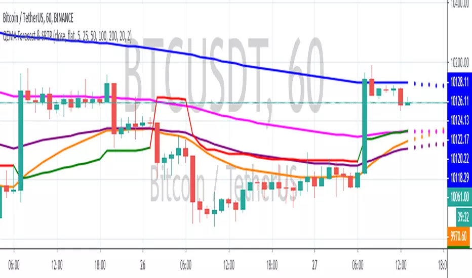 This script combine 4 EMA Forecast (21, 50, 100, 200) and a Stop and Reverse Signal based on volatility into one indicator.