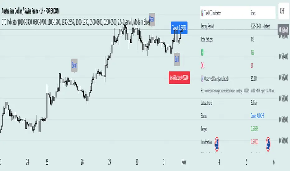 The DTC Indicator is designed for day traders who value logic over luck — offering full control over session windows, confirmation filters, and risk parameters.
