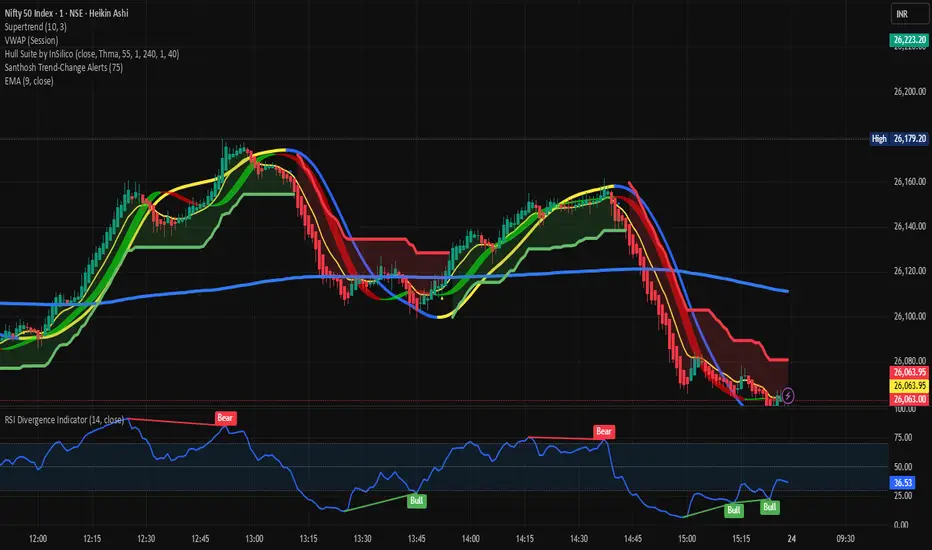 Santhosh Trend-Change Alerts : This indicator identifies potential trend change in market. i would suggest to use 1Min time frame with 75 Period ( Input). To have more accuracy on trading , add RSI Divergence (14) and Super trend (10,3)