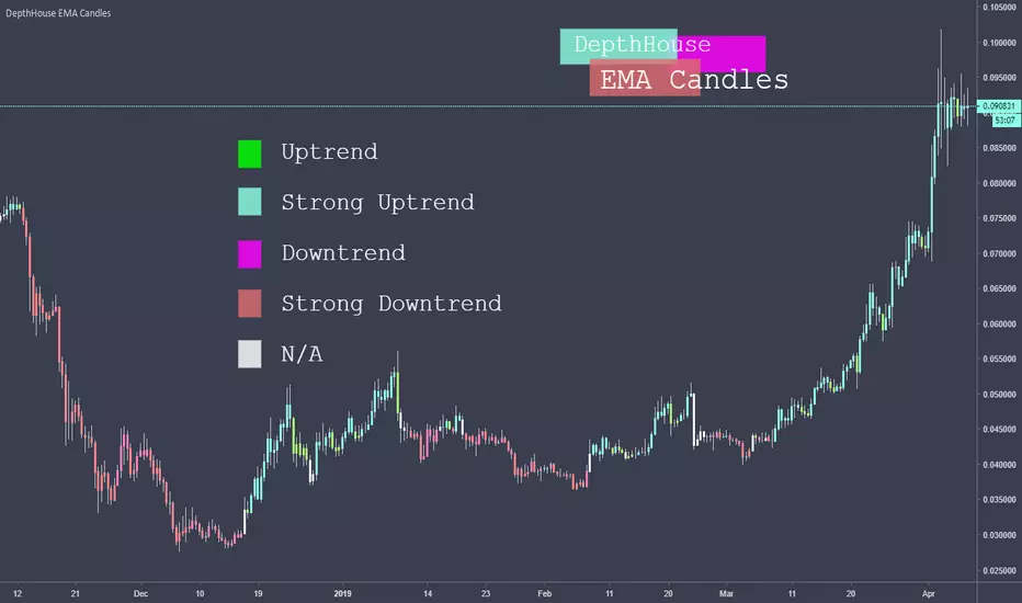 This EMA Candles indicator use the price movement between two user selected Exponential Moving Averages to help determine the current trend.