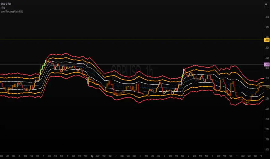 For example, the published chart shows the bands place around a Kaufman Adaptive Moving Average (KAMA), plotted in blue dots.