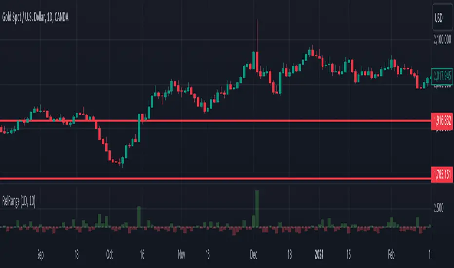 This script is designed to help you compare the size of the current price candle (the difference between the highest and lowest prices in a given time period) to the average size of the last several candles. It does this by calculating the average range of a certain number of previous candles (you can set how many with the "Length" input) and then dividing the current candle's range by this average. The result is plotted on the chart as a bar: if the current candle's range is larger than the average, the bar is green; if it's smaller, the bar is red. A horizontal line is also drawn at the value of 1, so you can easily see whether the current candle's range is above or below the average. If there’s an issue with the data, the script will show an error message to let you know.