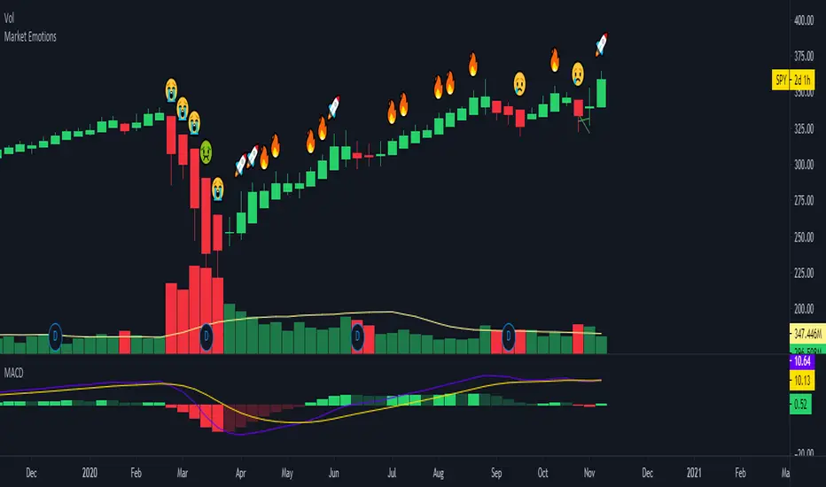 This is a simple and fun indicator I built out of boredom one night. It's great for a quick laugh, but other than that, it's useless. It simply displays emotes for various thresholds of change in price between the open and close of a candle. For example, unicorn candles are any candles that gain 25% or more from opening price to closing price.