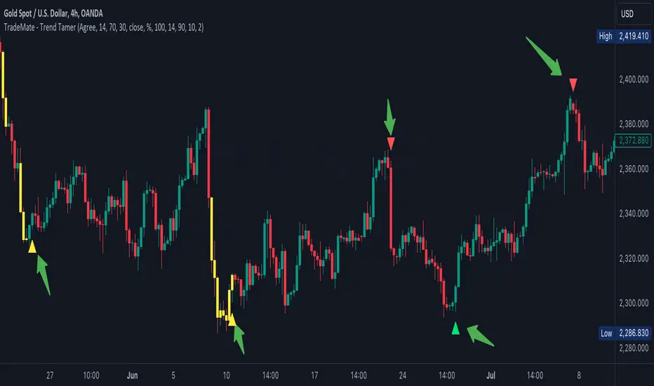 The TradeMate Trend Tamer is not just a mashup of indicators but a well-integrated system that enhances the reliability of trend detection. The core of this indicator is a custom EMA calculation that identifies trend shifts based on price momentum and directional changes. This EMA is further enhanced by a volatility detection system that colors bars yellow during periods of high volatility, indicating potential market reversals.
