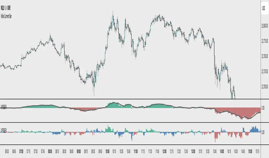 Supplemental Feature: Trade Timing Zones with Momentum ConfirmationThe latest enhancement introduces a second histogram that measures the deviation of the spread from its own EMA (ema01_spread - ema01_of_ema01). This creates a higher-order view of momentum within the price deviation signal itself.