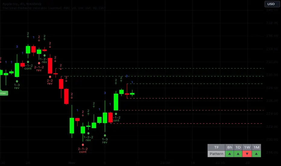 The Strat Patterns Indicator shows all Strat patterns directly on your chart, making it easier to spot trading opportunities in real-time. You can choose to show or hide specific patterns based on your preferences. The patterns include: