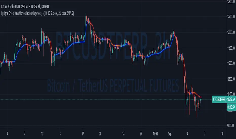 The DSMA by John Ehlers is an adaptive moving average that features rapid adaptation to volatility in price movement. It accomplishes this adaptation by modifying the alpha term of an EMA by the amplitude of an oscillator scaled in standard deviations from the mean