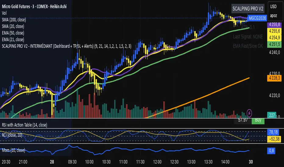 indicator("SCALPING PRO V2 - INTERMÉDIANT (Dashboard + TP/SL + Alerts)", overlay=true, max_labels_count=500)
